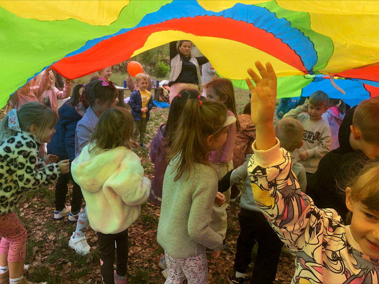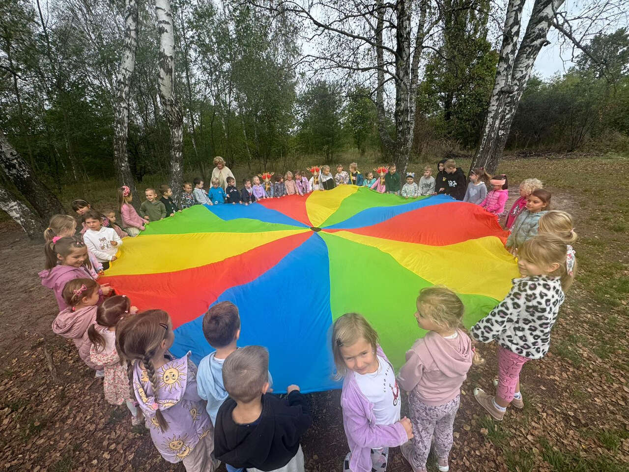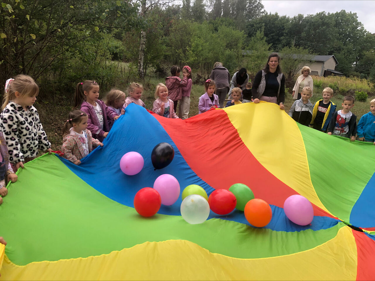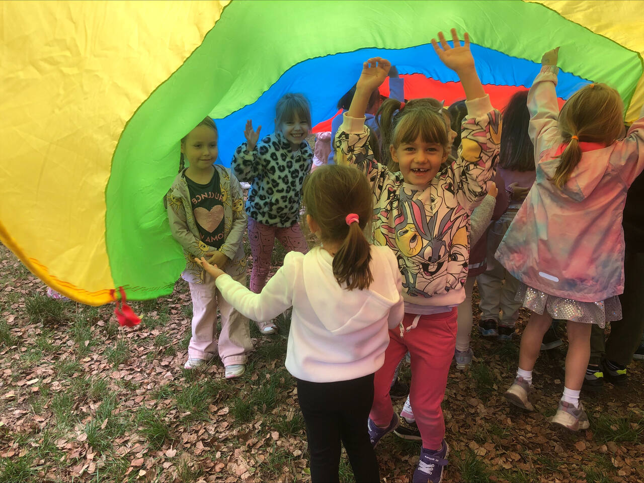 Dzień Przedszkola na świeżym powietrzu był pełen radości, ruchu i wspólnej zabawy. Dzieci uczestniczyły w różnych aktywnościach z wykorzystaniem kolorowej chusty animacyjnej, pod którą tworzyły „balonowe fale” i wspólnie podrzucały piłki niczym lekkie balony. Następnie odbyły się zawody z wykorzystaniem kolorowych okręgów — przedszkolaki skakały z kółka do kółka, ćwicząc równowagę i koordynację. Wszyscy bawili się doskonale, ucząc się współpracy, ruchu i radości z aktywności na świeżym powietrzu. To był dzień pełen śmiechu i pozytywnej energii.
