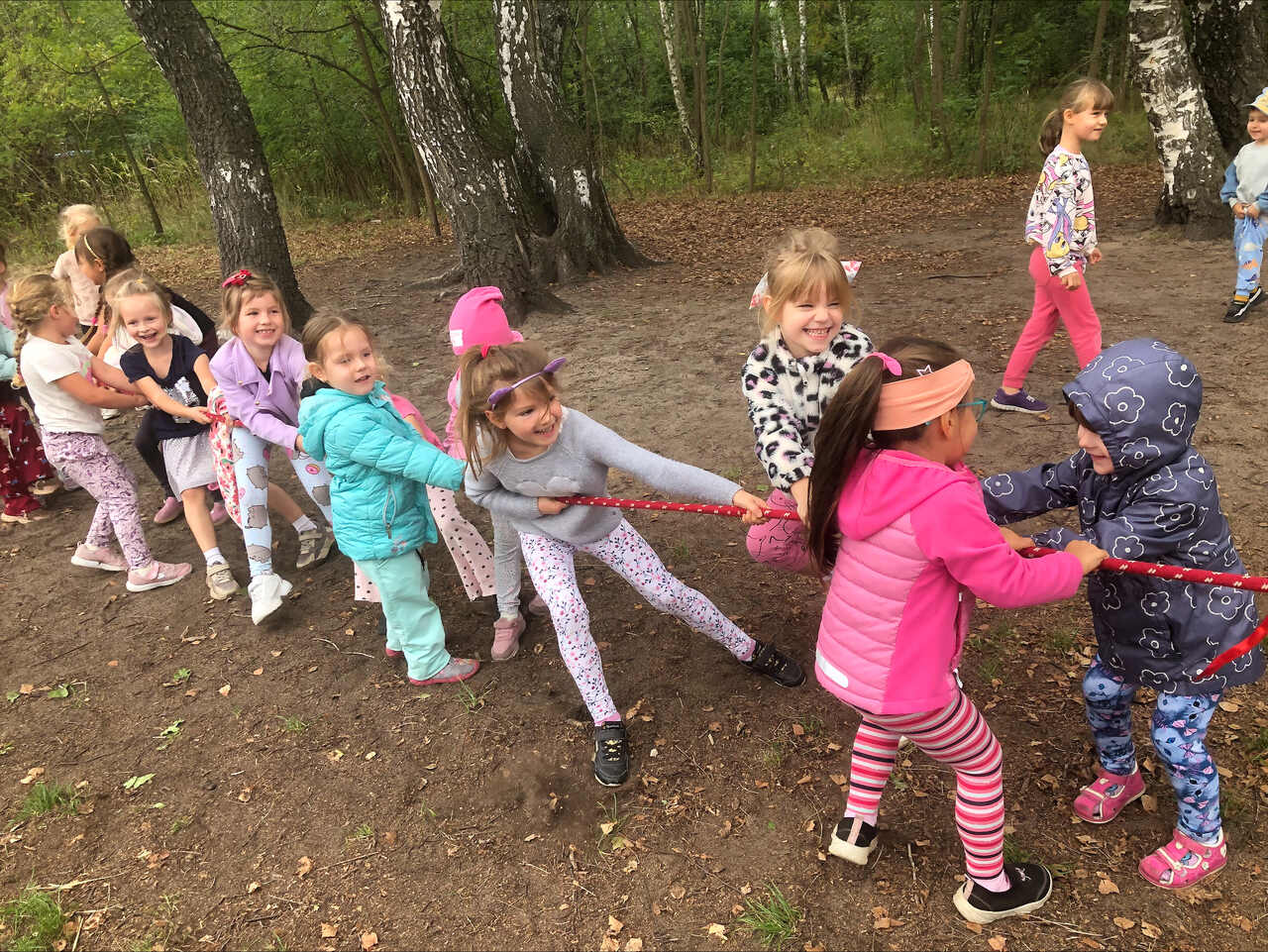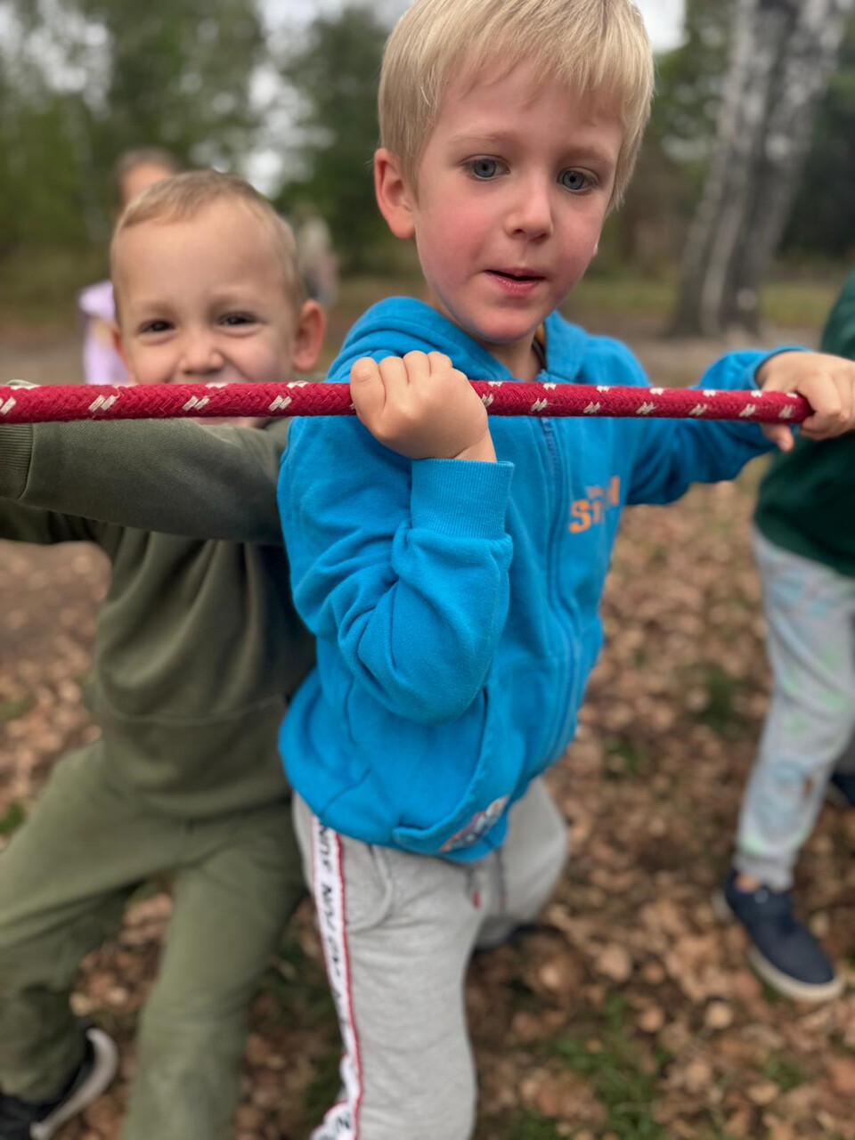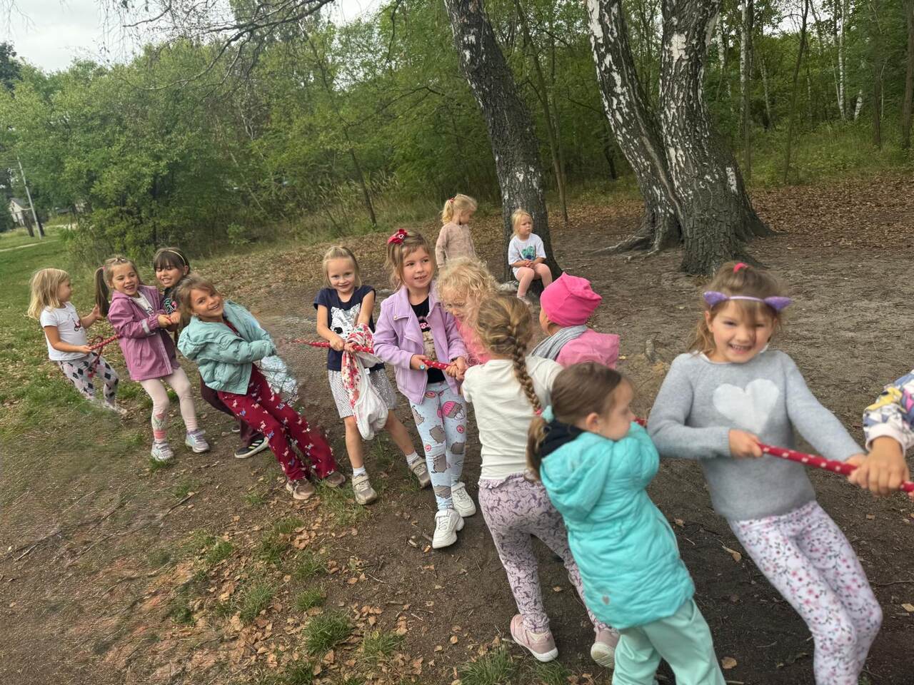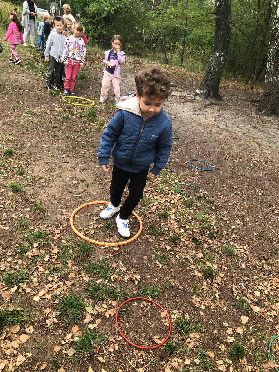 Dzień Przedszkola na świeżym powietrzu był pełen radości, ruchu i wspólnej zabawy. Dzieci uczestniczyły w różnych aktywnościach z wykorzystaniem kolorowej chusty animacyjnej, pod którą tworzyły „balonowe fale” i wspólnie podrzucały piłki niczym lekkie balony. Następnie odbyły się zawody z wykorzystaniem kolorowych okręgów — przedszkolaki skakały z kółka do kółka, ćwicząc równowagę i koordynację. Wszyscy bawili się doskonale, ucząc się współpracy, ruchu i radości z aktywności na świeżym powietrzu. To był dzień pełen śmiechu i pozytywnej energii.