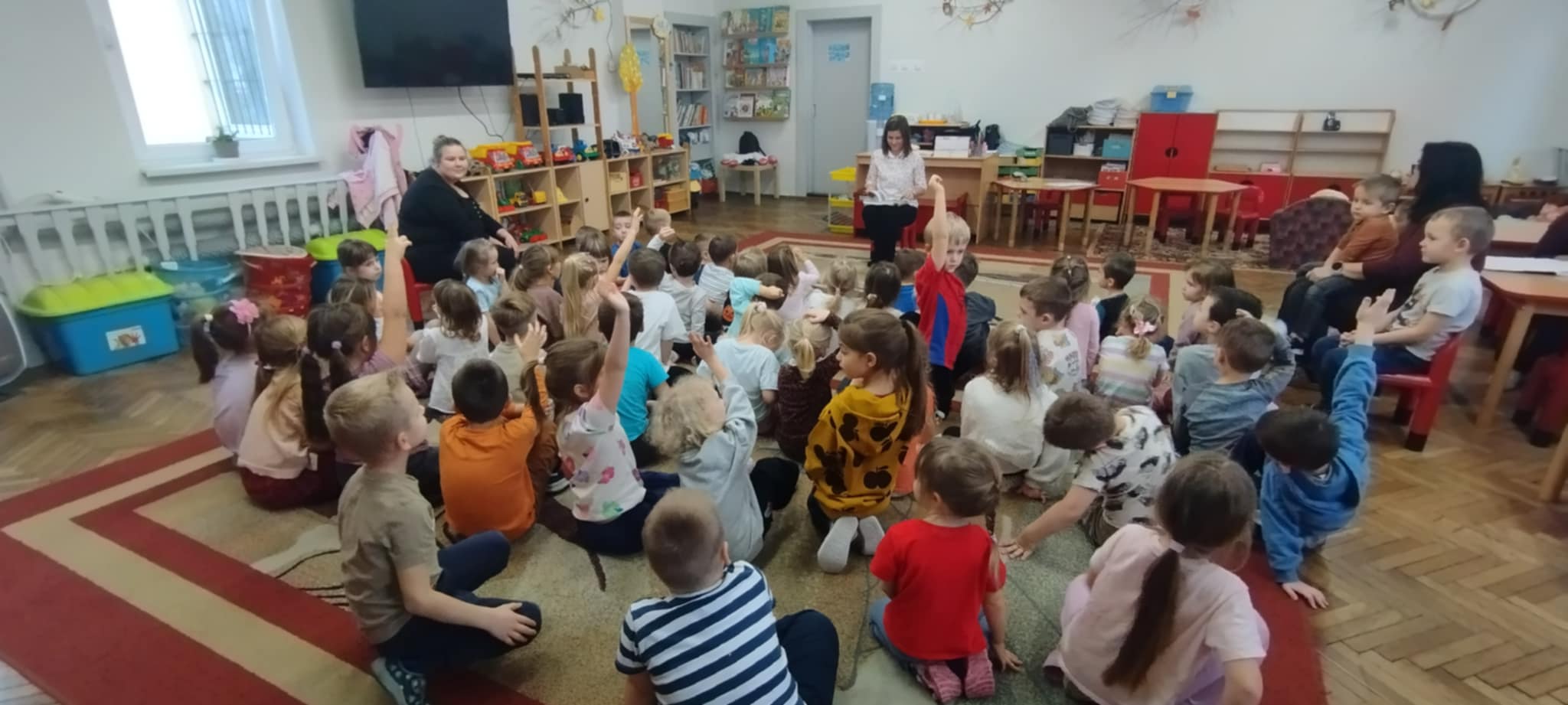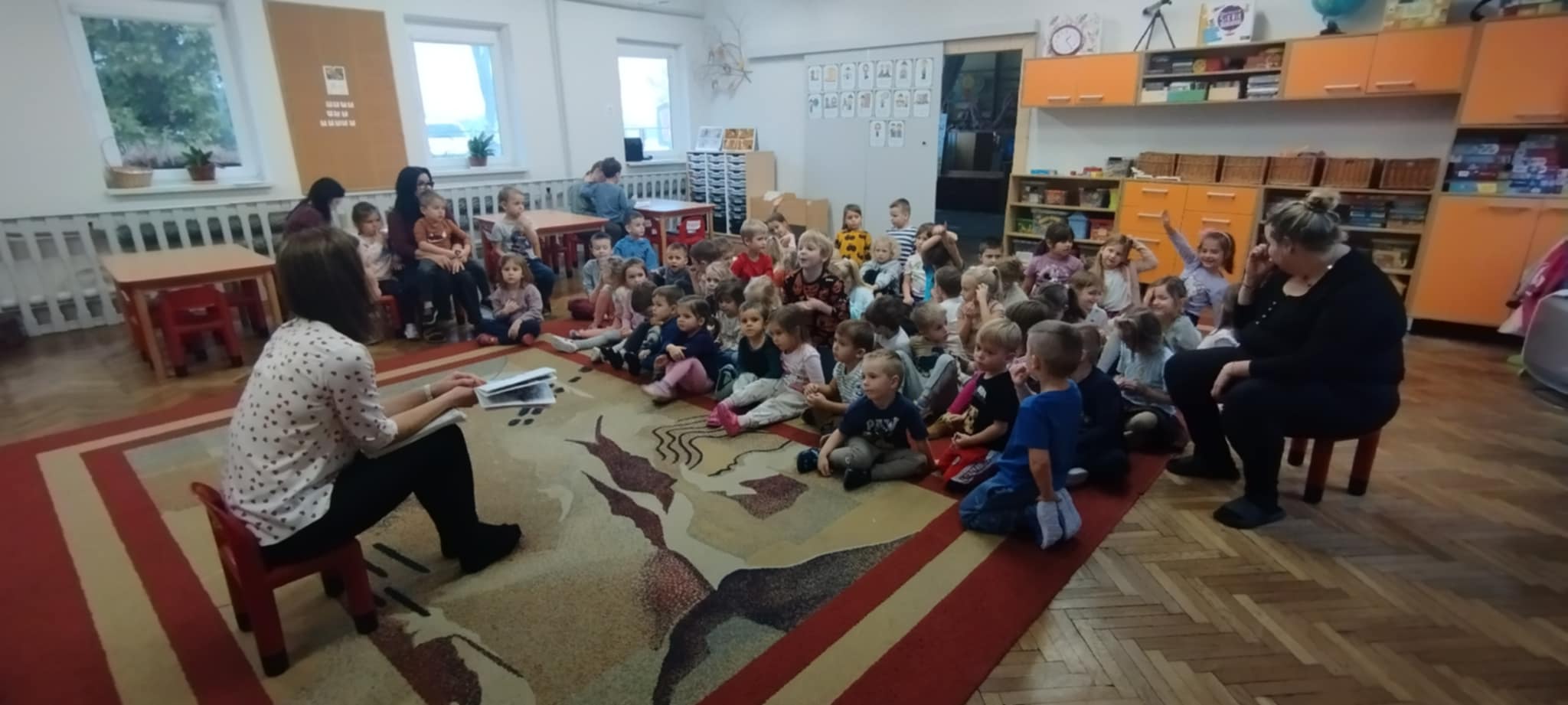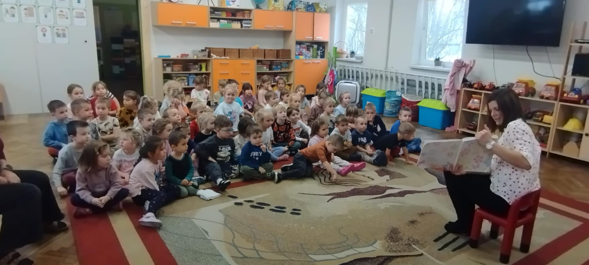 Przedszkolaki z zaciekawieniem śledzą ilustracje i wydarzenia z książki.