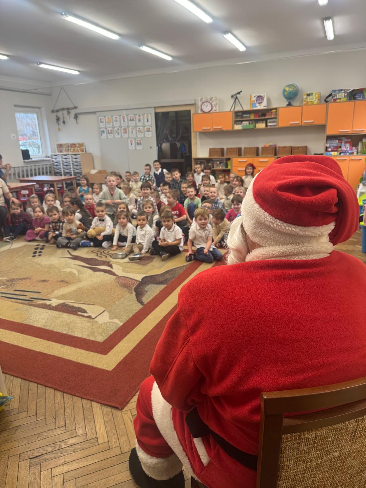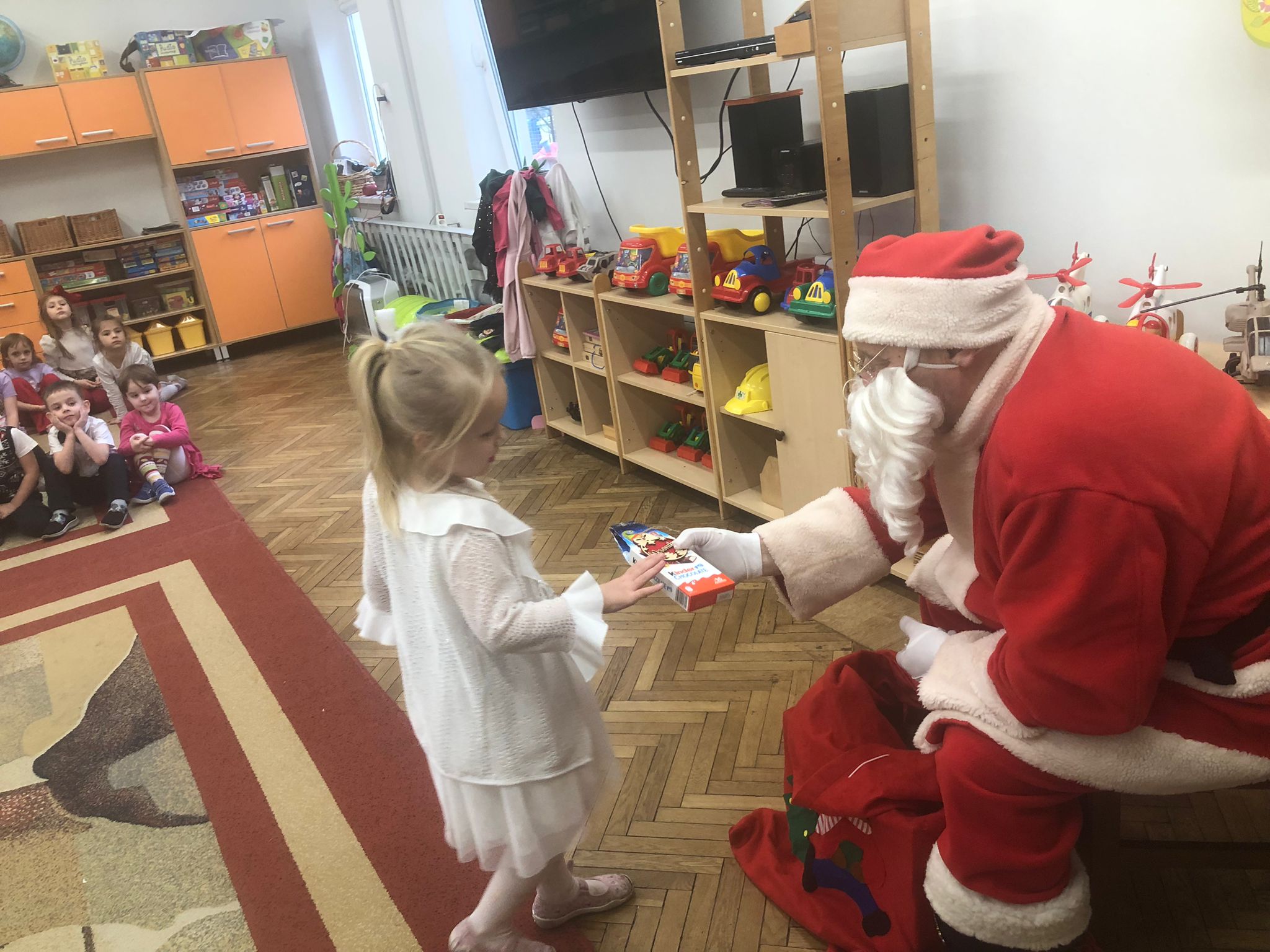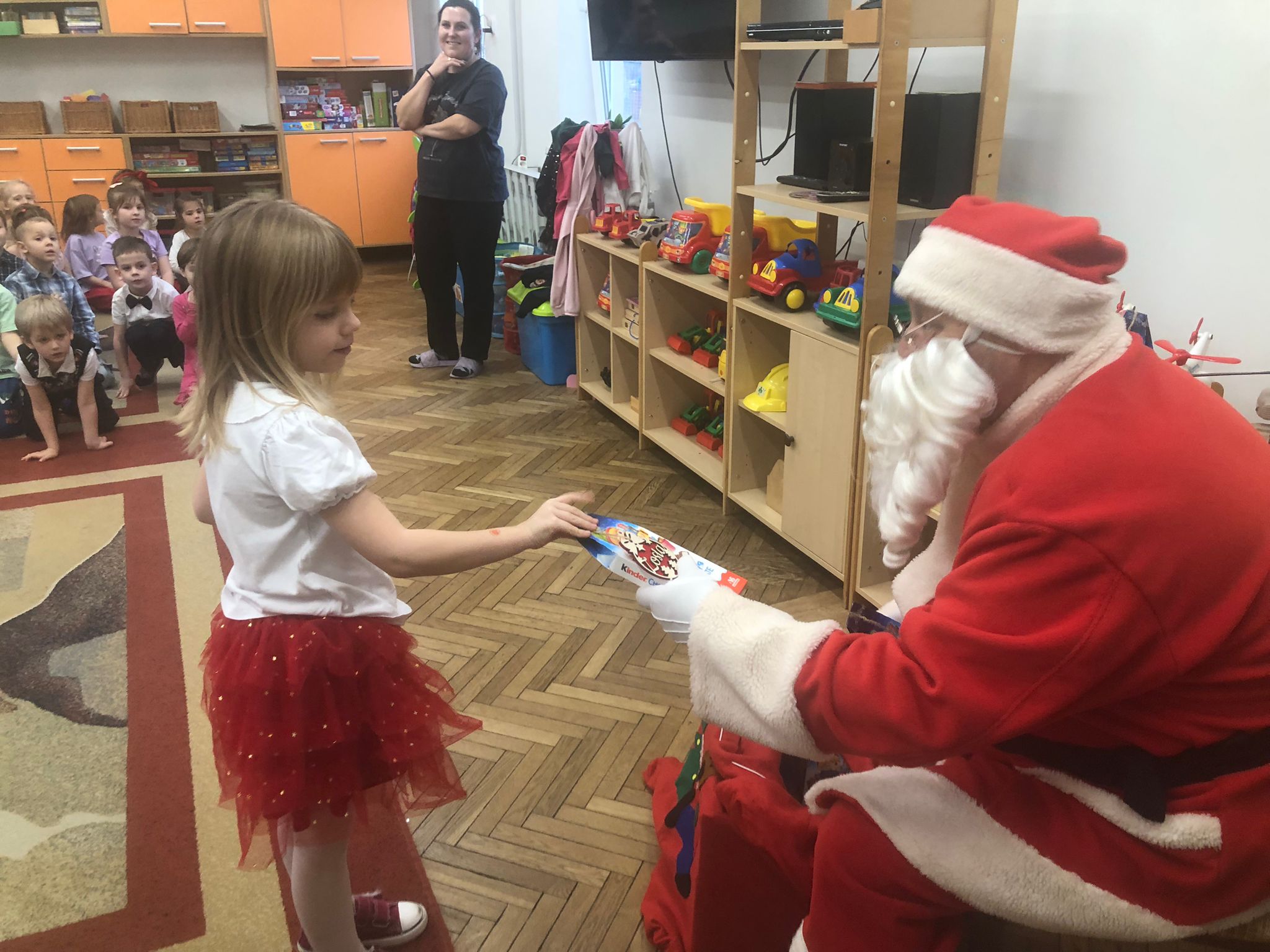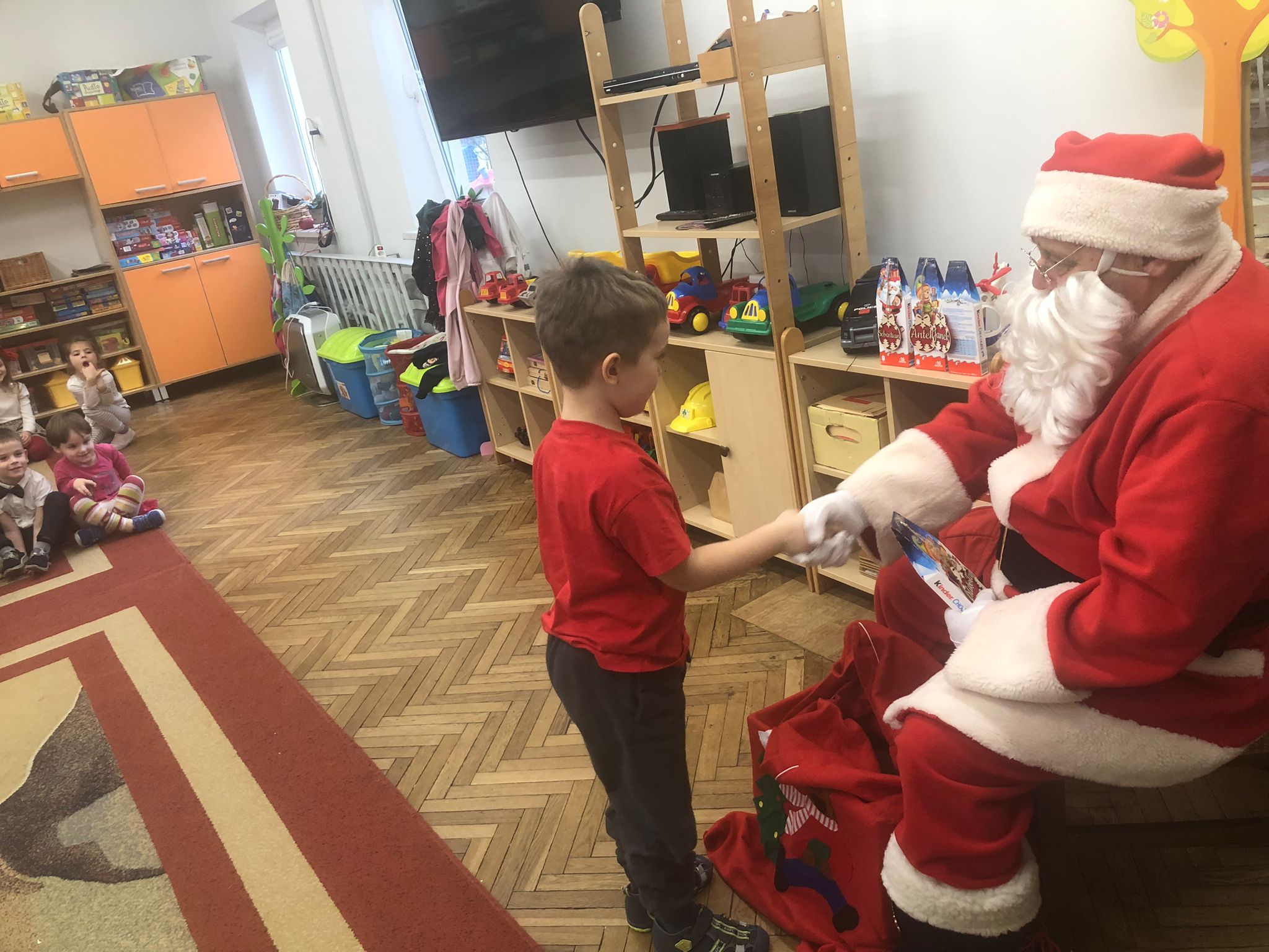 Przedszkolaki już od rana wypatrywały przez okno długo wyczekiwanego gościa i pomimo braku białego puchu, jak co roku przybył do nas na czas. Dzieci z ogromną radością przywitały Mikołaja śpiewając mu piosenki. Nie zabrakło pytań o otrzymane w nocy prezenty.