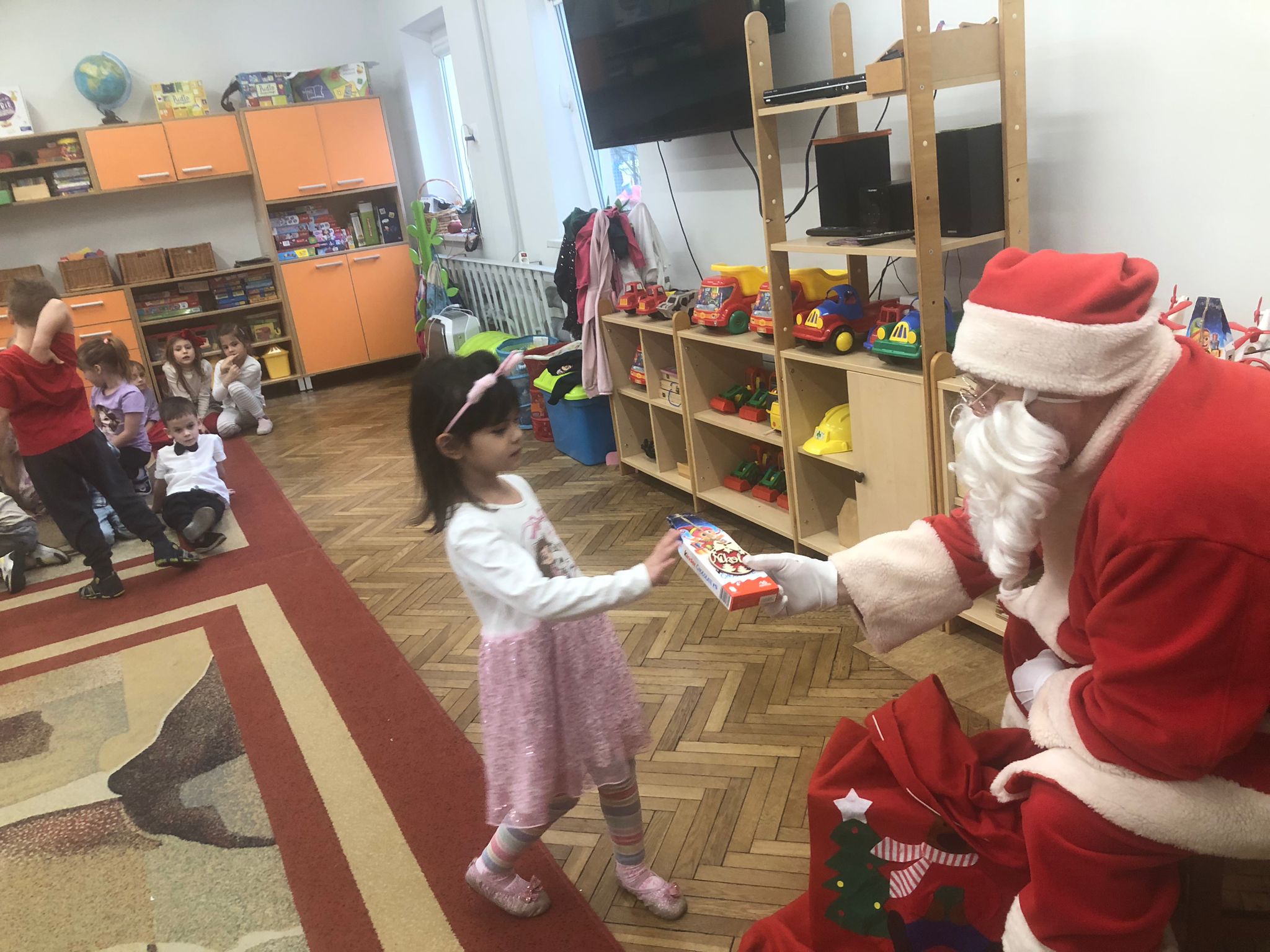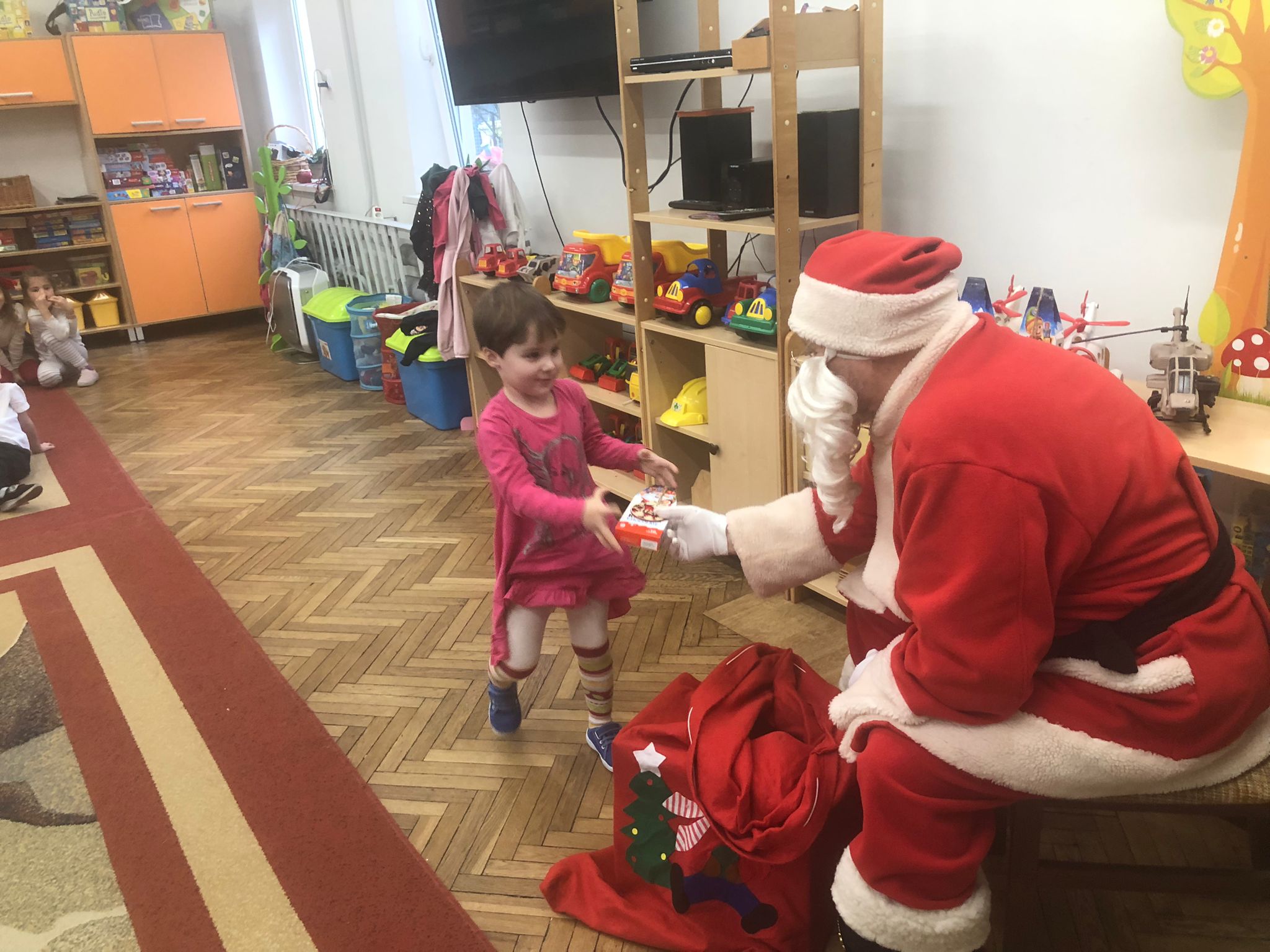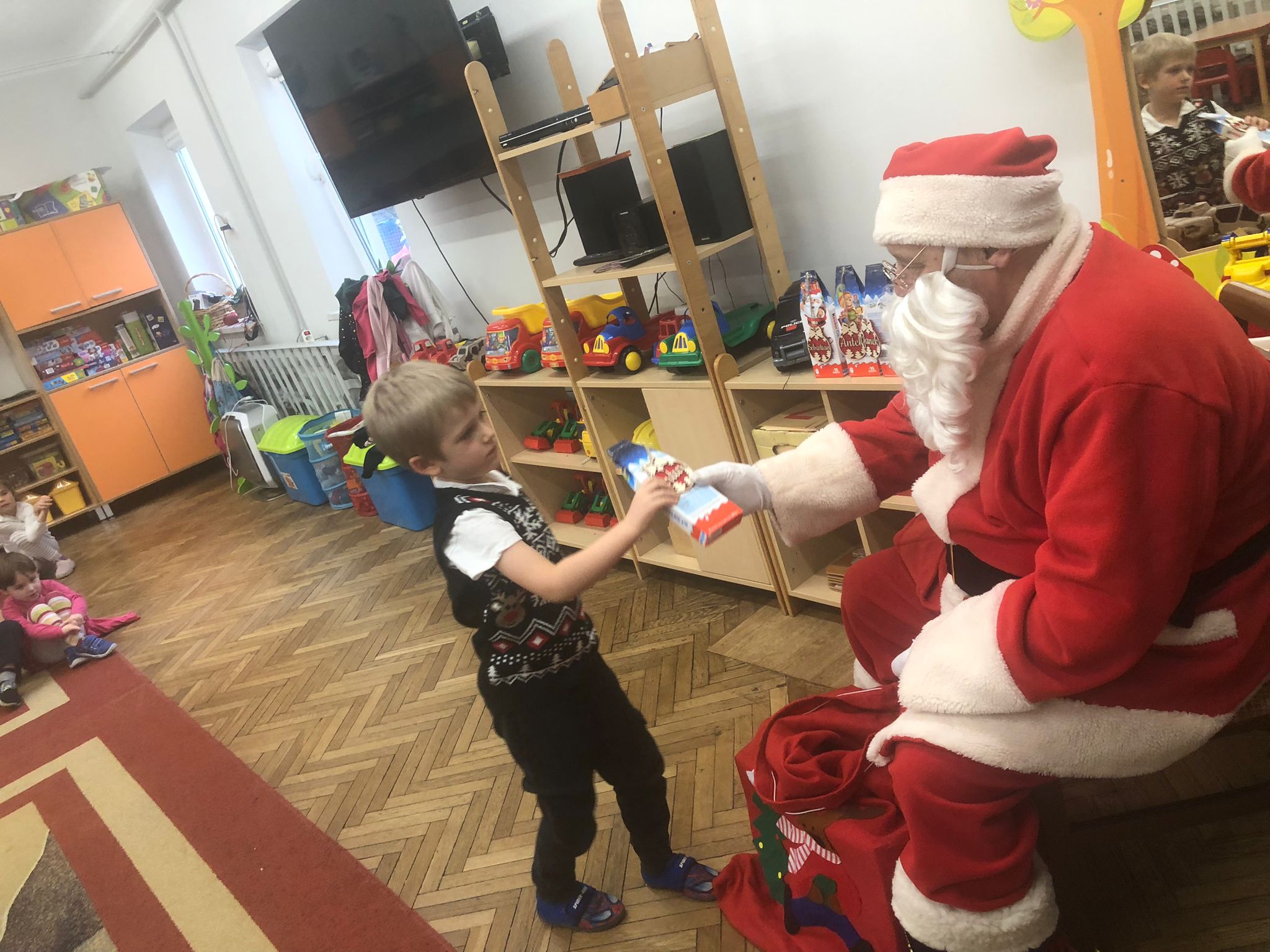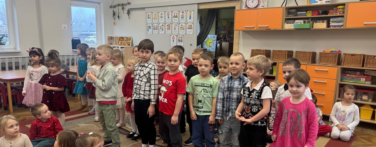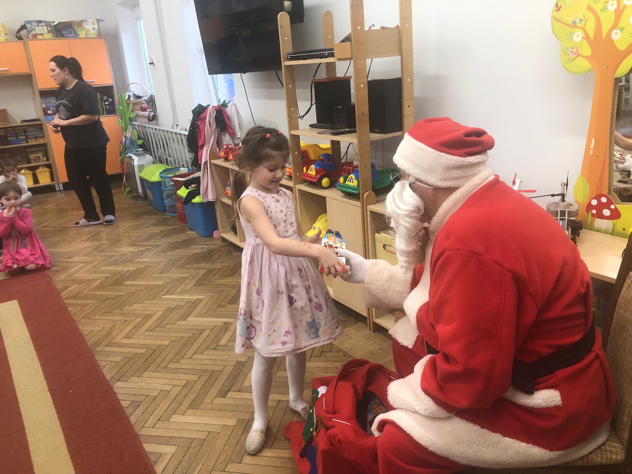 Przedszkolaki już od rana wypatrywały przez okno długo wyczekiwanego gościa i pomimo braku białego puchu, jak co roku przybył do nas na czas. Dzieci z ogromną radością przywitały Mikołaja śpiewając mu piosenki. Nie zabrakło pytań o otrzymane w nocy prezenty.