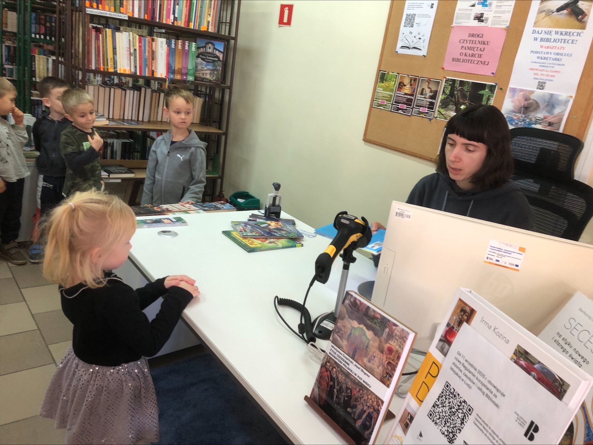 Podczas wizyty dzieci poznały panie bibliotekarki, które opowiedziały im o swojej pracy, oprowadziły po różnych działach biblioteki i pokazały, gdzie znajdują się książki przeznaczone specjalnie dla najmłodszych czytelników. Dzieci dowiedziały się, jak należy dbać o książki i w jaki sposób można je wypożyczyć, aby zabrać do domu. Na zakończenie podziękowały za spotkanie i otrzymały zakładki do książek.